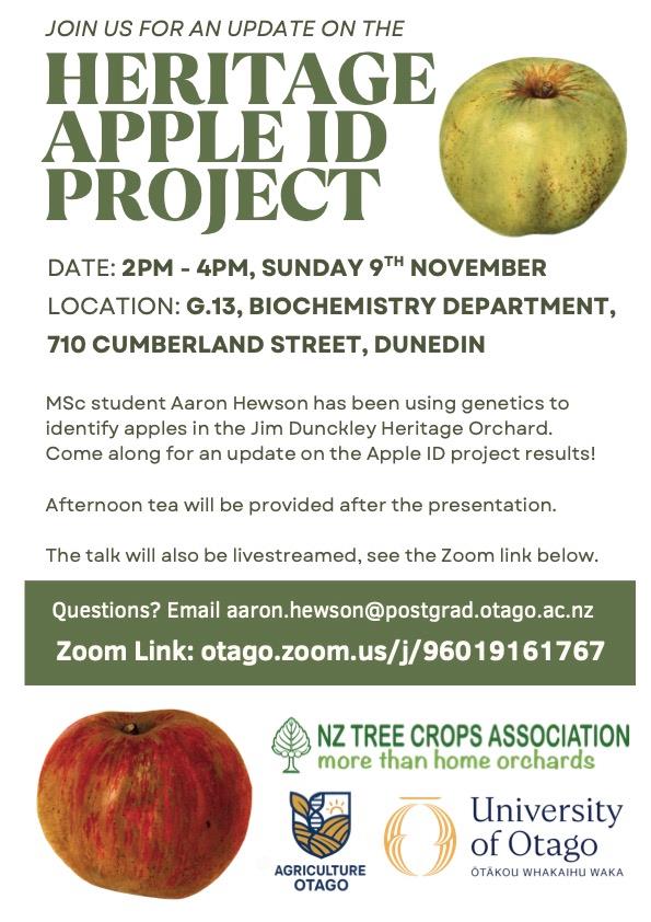 HERITAGE APPLE ID PROJECTDATE: 2PM - 4PM, SUNDAY 9TH NOVEMBERLOCATION: G.13, BIOCHEMISTRY DEPARTMENT,710 CUMBERLAND STREET, DUNEDINMSc student Aaron Hewson has been using genetics to identify apples in the Jim Dunckley Heritage Orchard.Come along for an update on the Apple ID project resultsAfternoon tea will be provided after the presentation.The talk will also be livestreamed, see the Zoom link below.Questions? Email aaron.hewson@postgrad.otago.ac.nzZoom Link: otago.zoom.us/j/96019161767It is planned that the talk will be recorded and put on the Tree Crops Website members area.